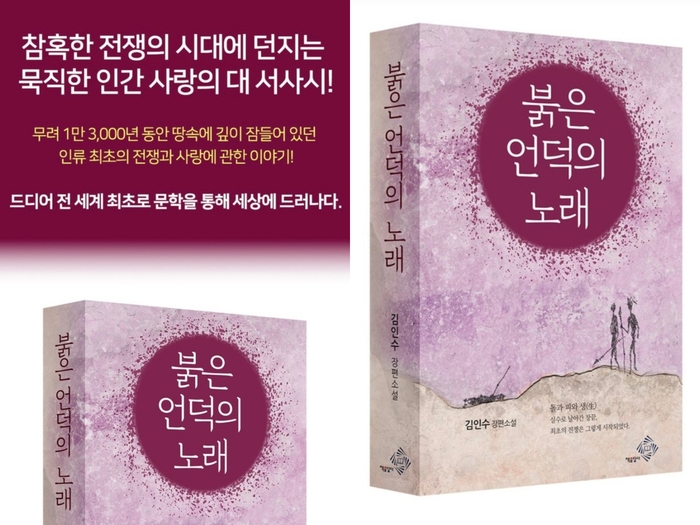 ![]() ▲ 김인수 작가가 신작 장편소설 『붉은 언덕의 노래』를 들고 있는 이미지. 1만 3천 년 전 인류 최초의 전쟁터 ‘제벨 사하바’를 배경으로 전쟁의 기원과 인간의 사랑을 그린 대작이다. / 사진=챌린지뉴스 |
